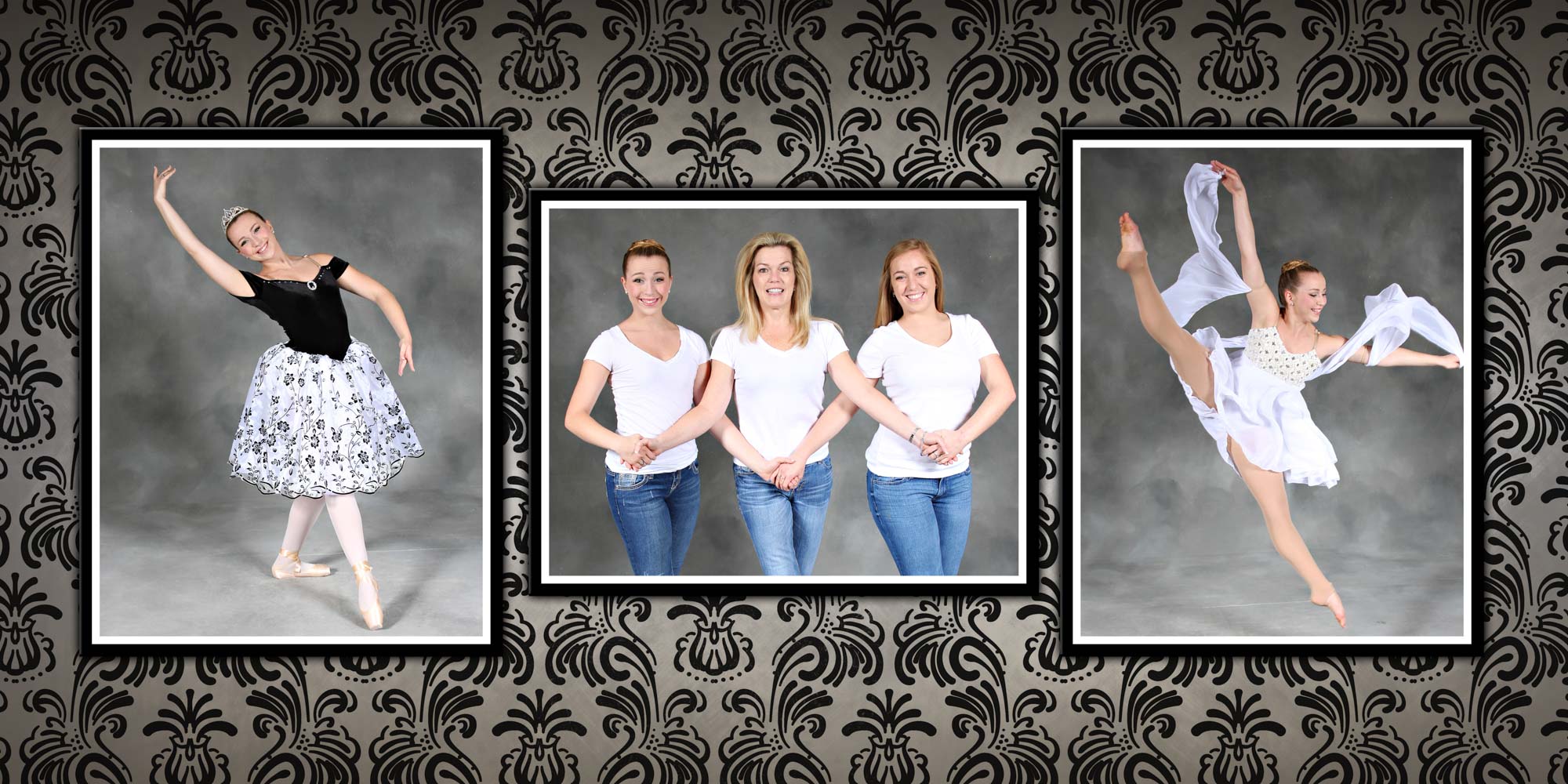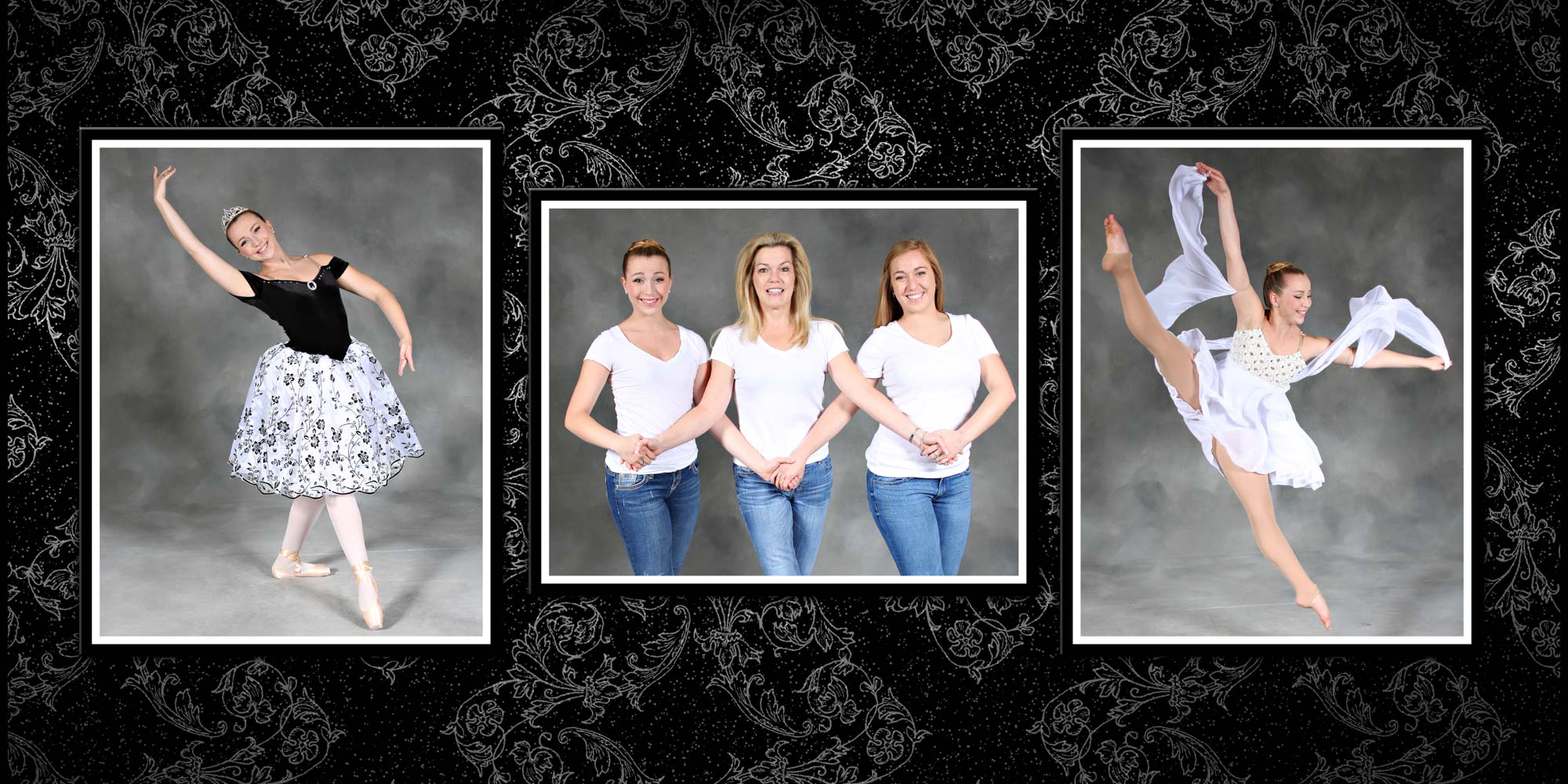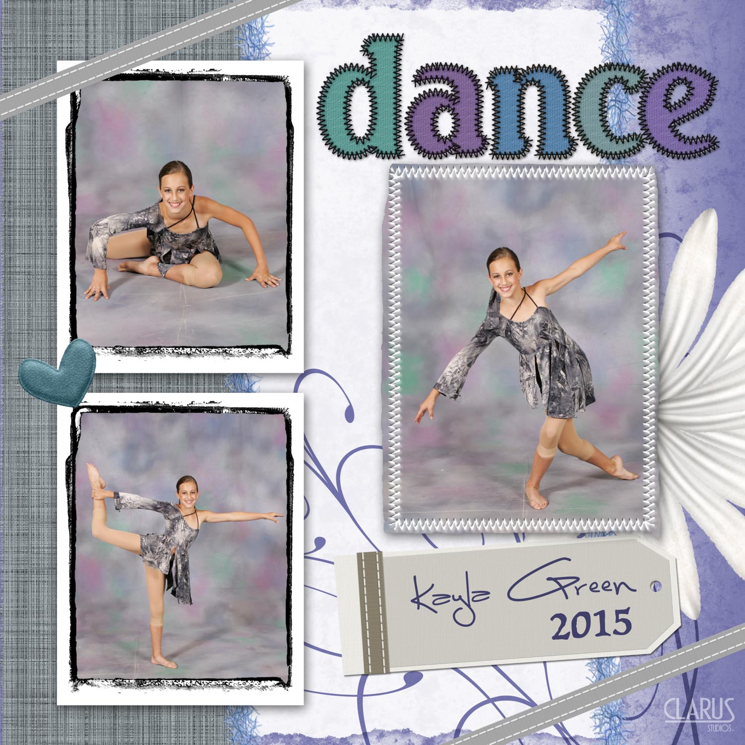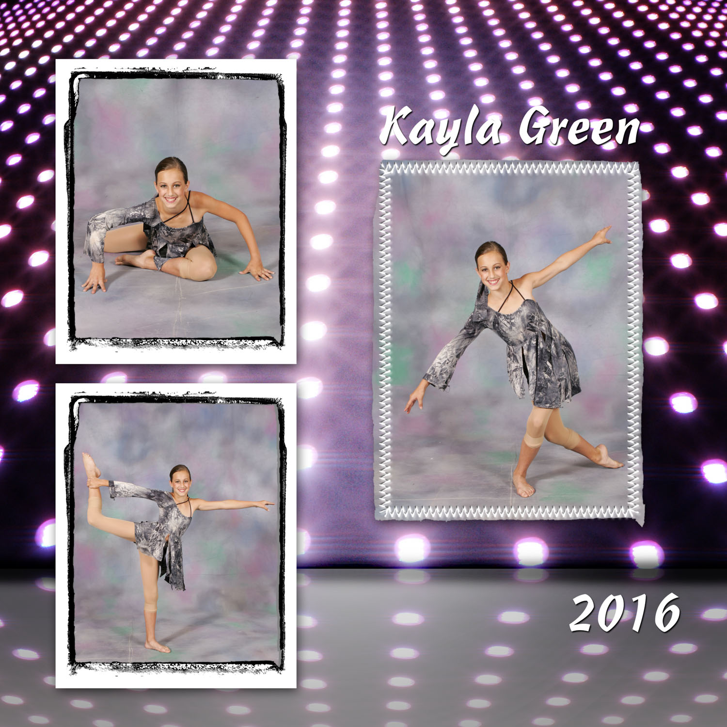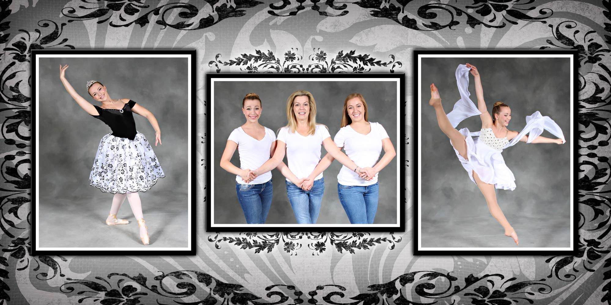 4 different design choices with a maximum of 3 images on the page, we can do all horizontal images, all vertical images or a mix of both. You can select where you would like each image before placing the order. As well we can add any text you would like to the page, such as Name, date, dance number, studio name etc.